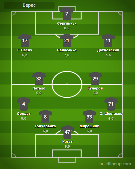 «Верес» (замены): М. Шестаков – 6,0, Е. Пасич – 6,0, Гегедош – 6,0.