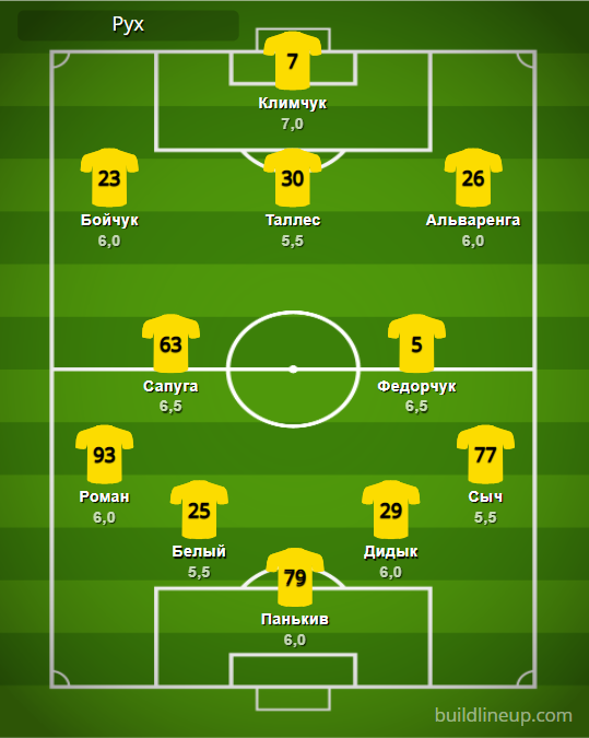 «Рух»: Панькив – Роман, Белый, Дидык, Сыч – Сапуга, Федорчук – Бойчук (Мысык, 67), Таллес (Притула, 79), Альваренга (Рунич, 67) – Климчук.