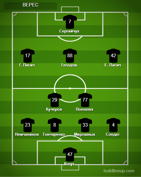 «Верес»: Когут, Солдат, Мирошнык, Гончаренко, Немчанинов, Полюлях (Клец, 71), Кучеров, Е. Пасич (Дахновский, 86), Гегедош (Гечев, 76), Г. Пасич (Тымофиенко, 86), Сергийчук (Гайдучик, 86).