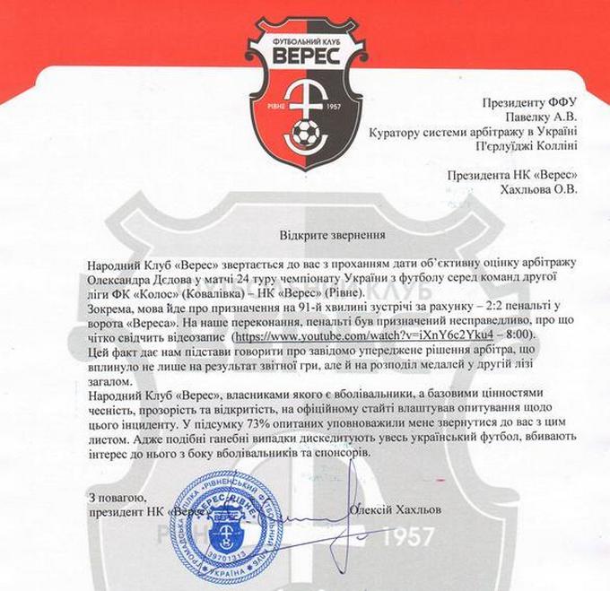 «Народний Клуб «Верес» звертається до вас з проханням дати об'єктивну оцінку арбітражу Олександра Дєдова у матчі 24 туру чемпіонату України з футболу серед команд другої ліги ФК «Колос» (Ковалівка) – НК «Верес» (Рівне).